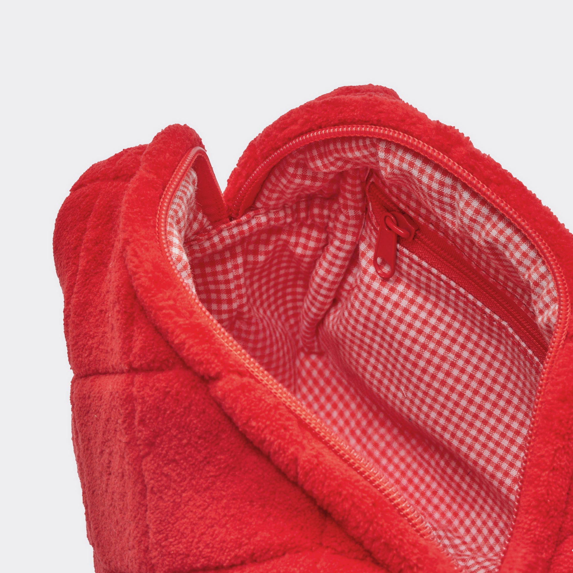 The exterior is made from thick, soft red teddy fabric, while the interior is lined with 100% cotton red gingham fabric.